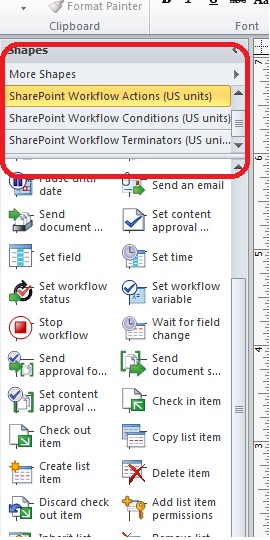 Now User who is familiar with Microsoft Visio, opens the Visio 2010, select the Microsoft SharePoint Workflow template, User can notice SharePoint Workflow activity grouped together as  SharePoint Workflow Action,SharePoint Workflow Conditions and SharePoint Workflow Terminators.