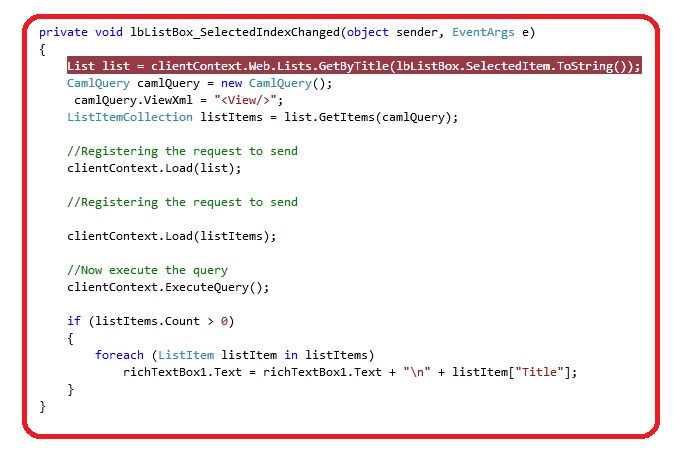 As it can be noticed from the below application i have placed a TextBox for submitting Site URL, a button to retrieve the List collection into the ListBox Control and DataGridView to display the Item Field Title