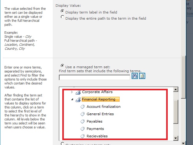 Lets have an Example, i have site collection for my Finance Department. I have created document library for uploading or creating the documents there, but the problem is that it is very difficult to figure out which document belongs to the Finance–> Financial Reporting–>Payables, so it means that if i am contributing a documents in this regard so there should be metadata for this document library which not only maintains the hierarchical structure of the document at its own but also it can be followed in the site collection scope.