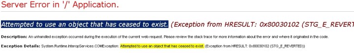 Exception Details: System.Runtime.InteropServices.COMException: Attempted to use an object that has ceased to exist. (Exception from HRESULT: 0x80030102 (STG_E_REVERTED))
