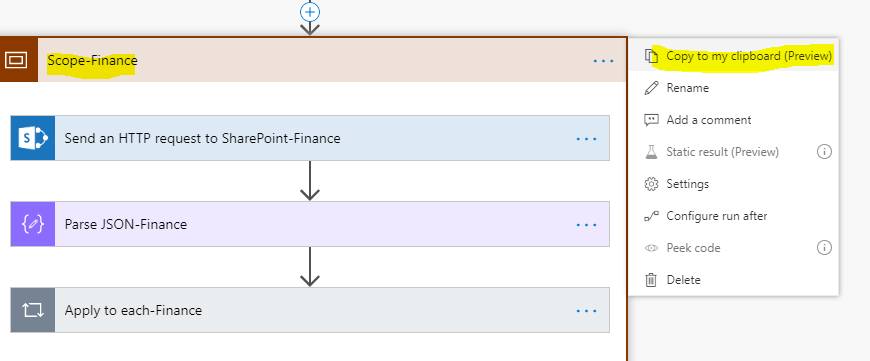 A Quick tip, if you want to move some of action from one Flow to another, Simply click on the source action (…) and click on the “Copy to my clipboard (Preview)”. This will make the action available on other flow. Now on other flow, where you want that action click on the Add Action and under Clipboard tab, you can find your recently added … Continue reading Add Action from one flow to another flow